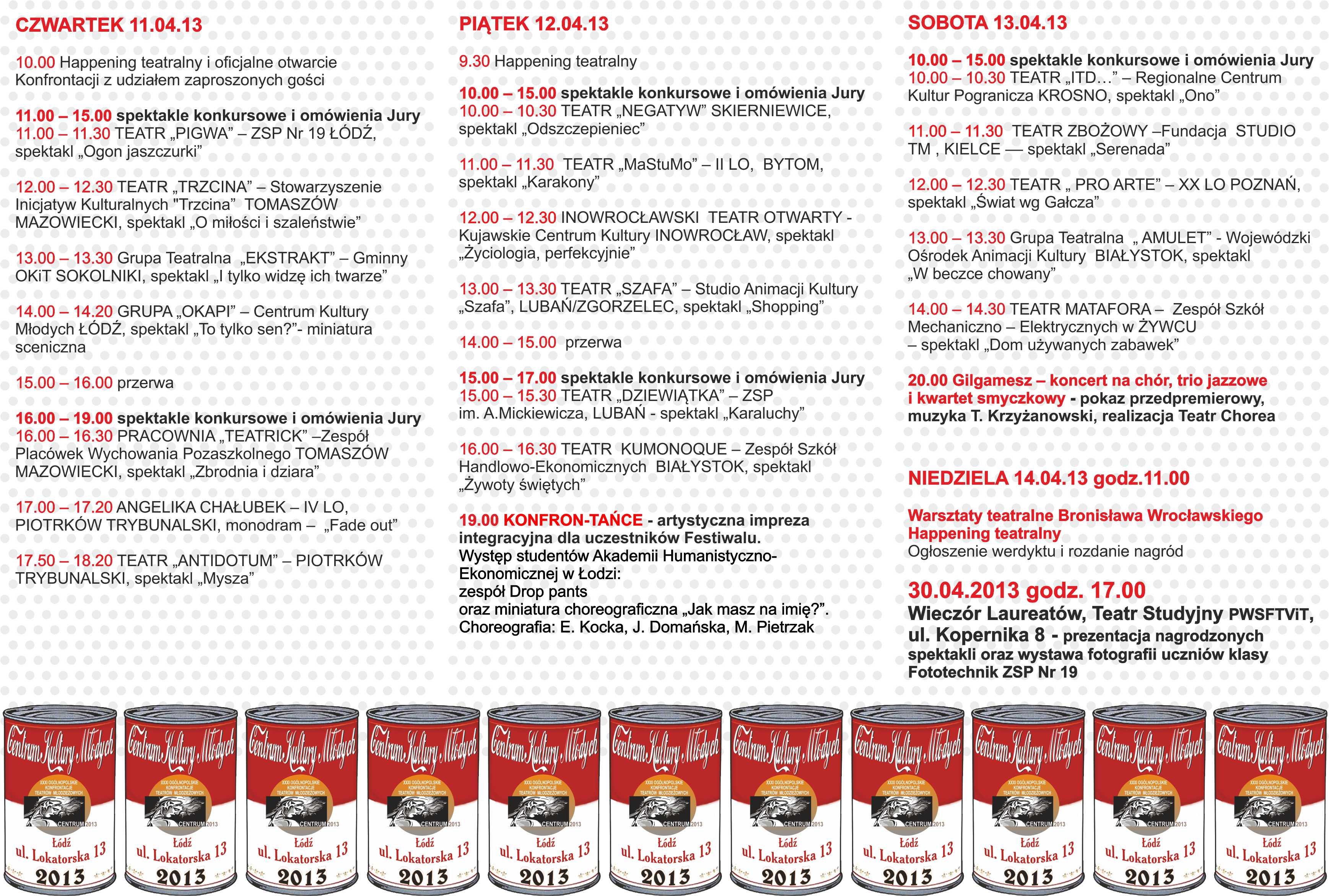 W programie konfrontacji znajdziemy kilkanaście przedstawień konkursowych i wydarzeń towarzyszących. Jednym z nich jest występ studentów kierunku "Taniec" AHE. Zaprezentowana zostanie miniatura choreograficzna "Jak masz na imię?" (Choreografia: E. Kocka, J. Domańska, M.Pietrzak). Przed publicznością wystąpi także zespół muzyczny Drop pants, który tworzą studenci kierunku Kulturoznawstwo.