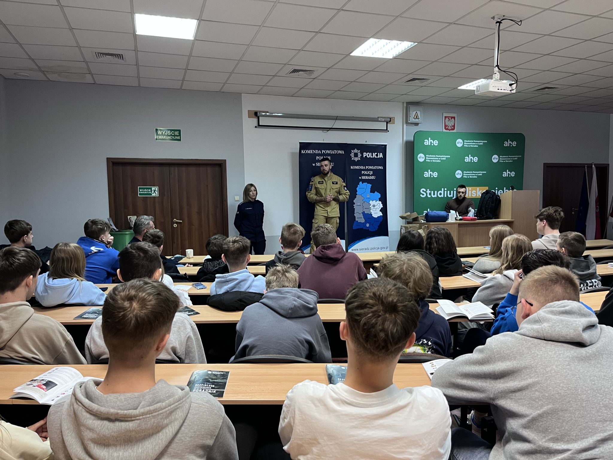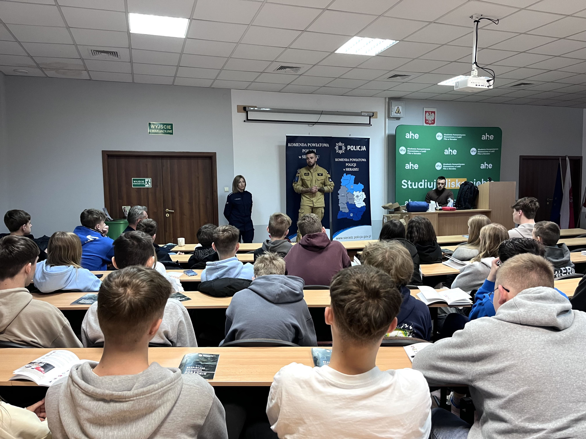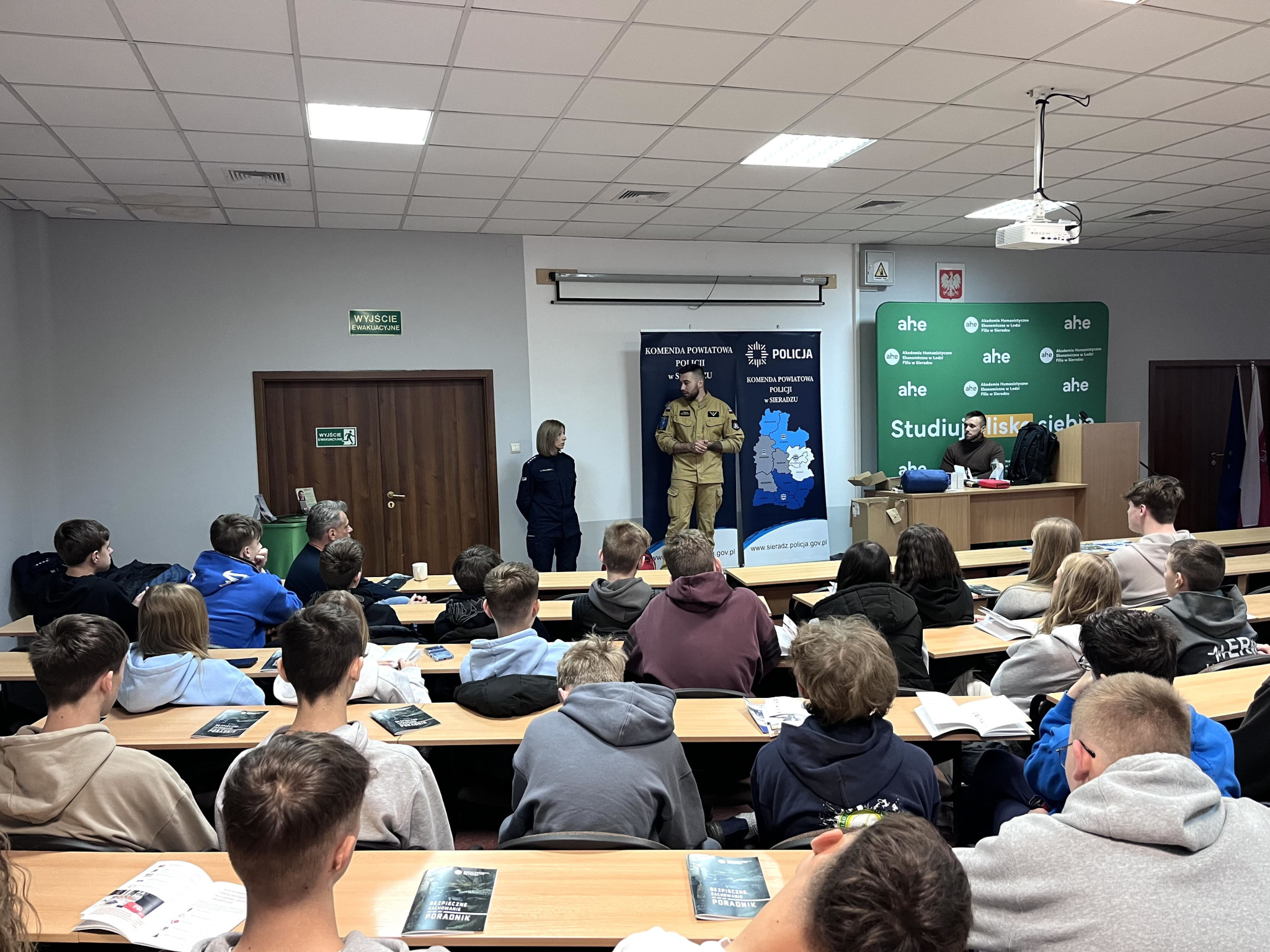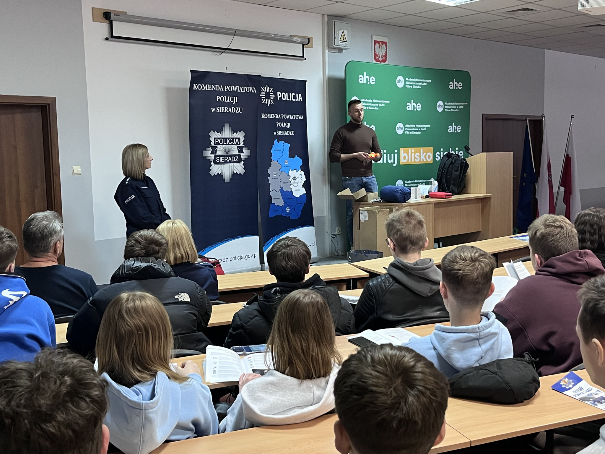 Podczas wydarzenia realne wdrożenie tematyki poradnika zaprezentowali: asp. szt. Agnieszka Kulawiecka – oficer prasowy Komendy Powiatowej Policji w Sieradzu, st. asp. Bożena Grobelna – profilaktyk KPP w Sieradzu, oraz studenci Filii AHE w Sieradzu - st. szer. Piotr Żmudziński oraz mł. asp. Dominik Żmudziński.