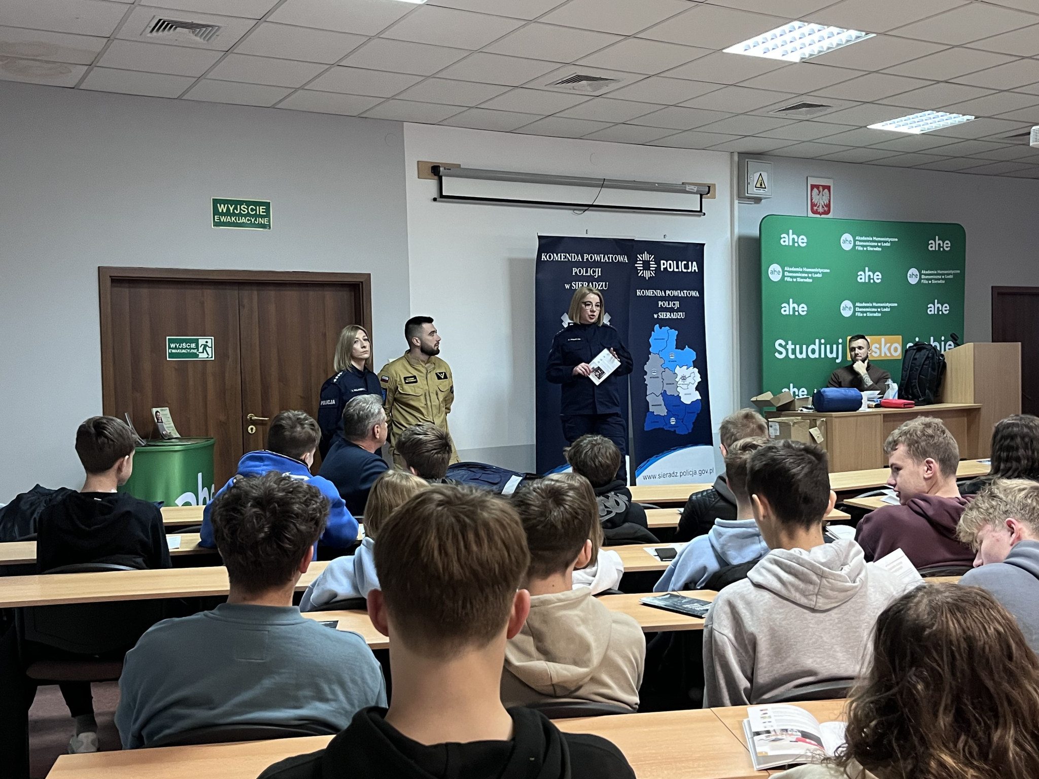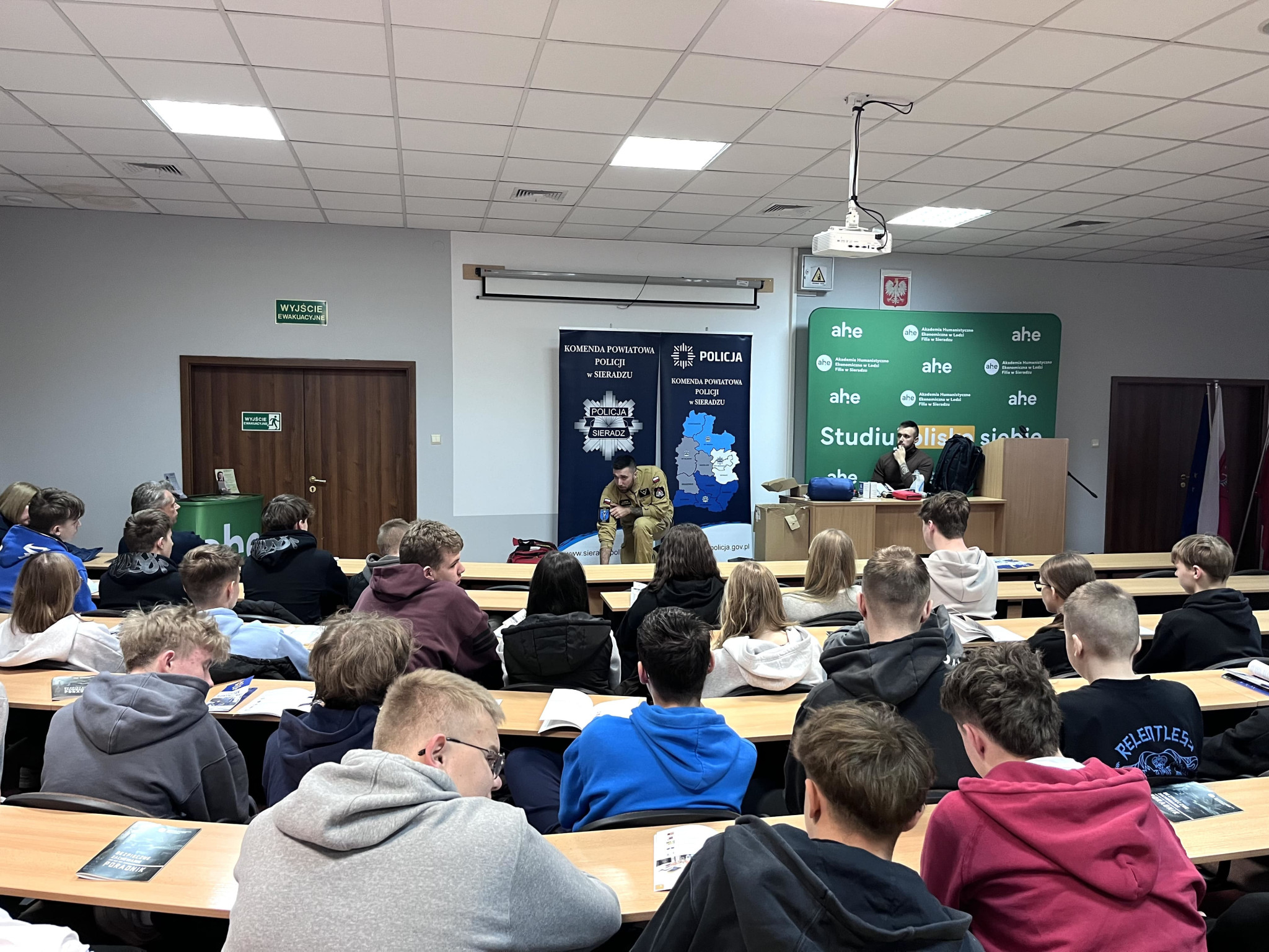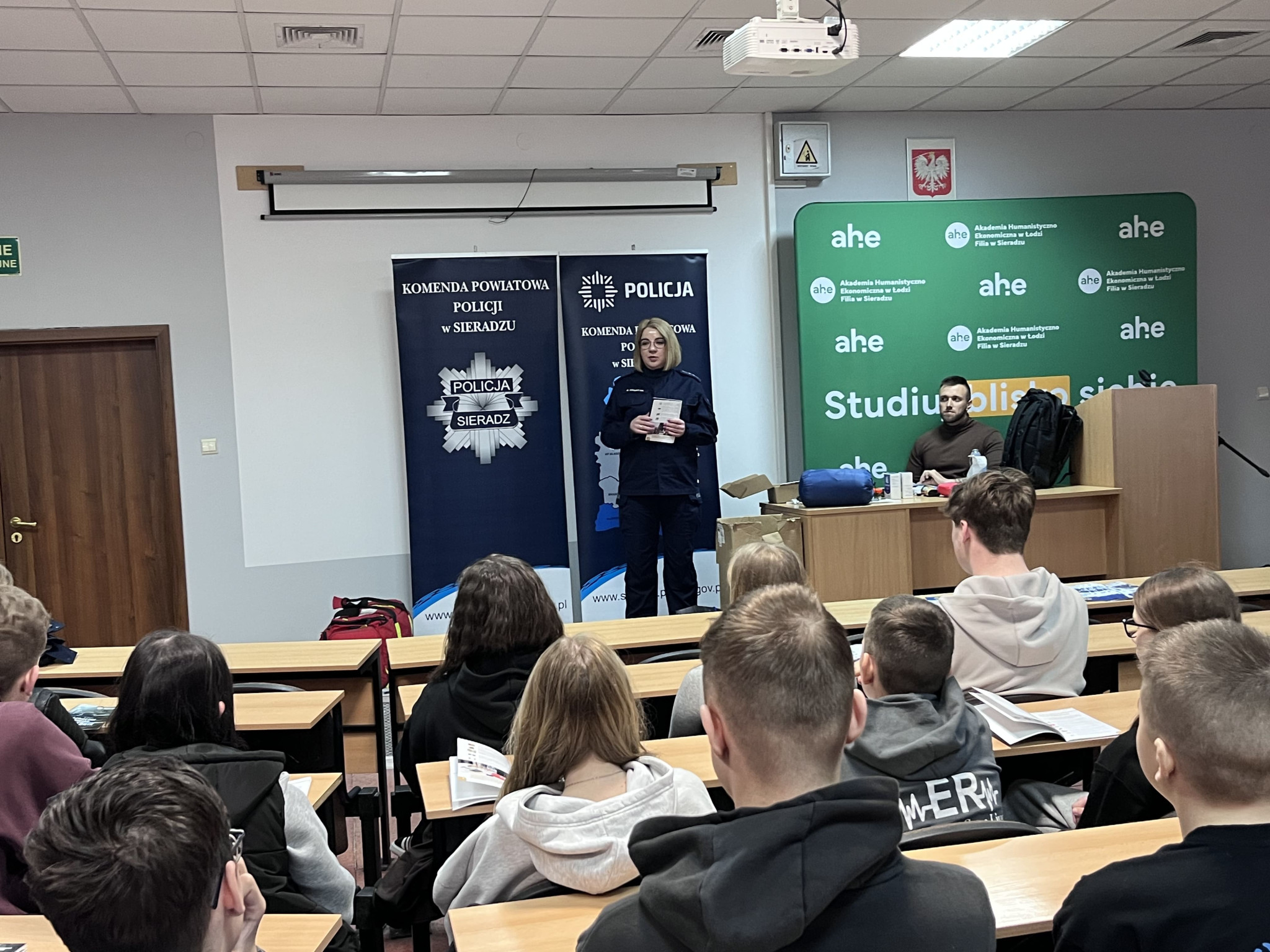 Podczas wydarzenia realne wdrożenie tematyki poradnika zaprezentowali: asp. szt. Agnieszka Kulawiecka – oficer prasowy Komendy Powiatowej Policji w Sieradzu, st. asp. Bożena Grobelna – profilaktyk KPP w Sieradzu, oraz studenci Filii AHE w Sieradzu - st. szer. Piotr Żmudziński oraz mł. asp. Dominik Żmudziński.