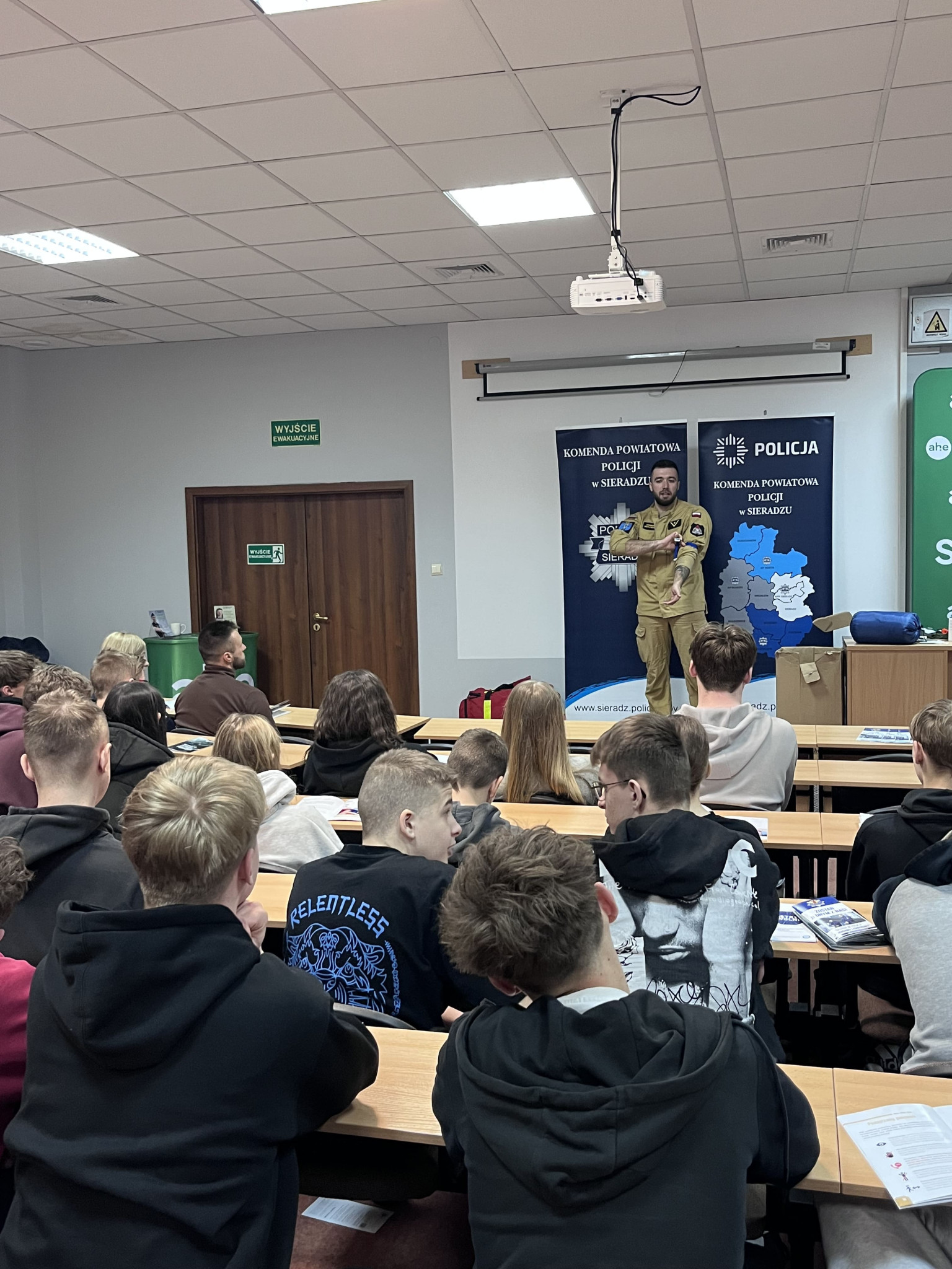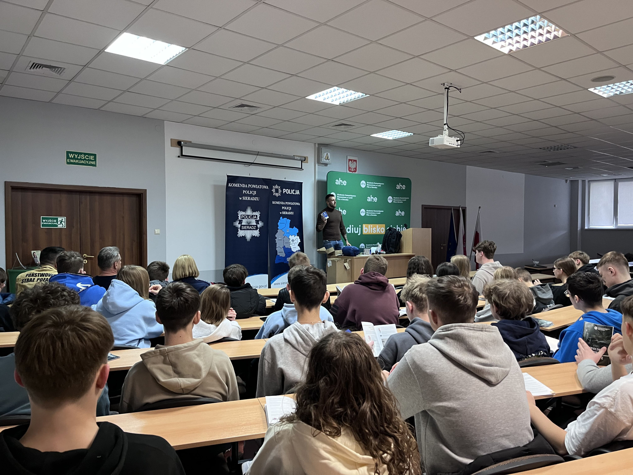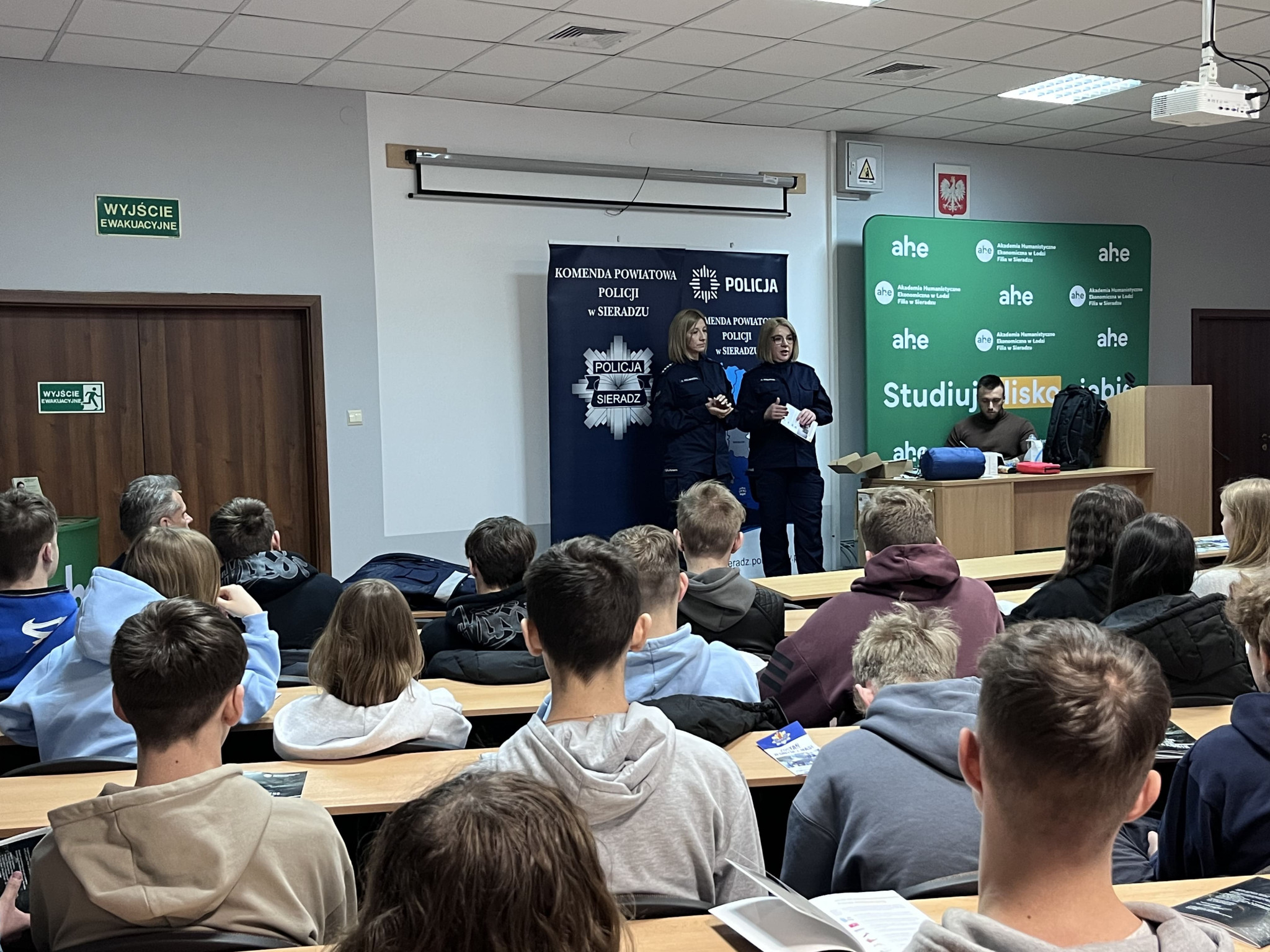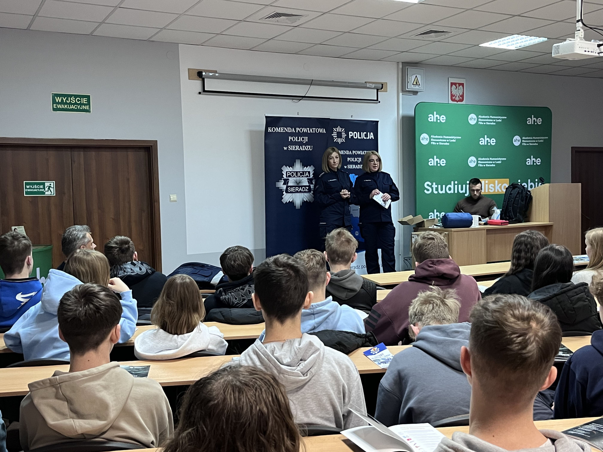 Podczas wydarzenia realne wdrożenie tematyki poradnika zaprezentowali: asp. szt. Agnieszka Kulawiecka – oficer prasowy Komendy Powiatowej Policji w Sieradzu, st. asp. Bożena Grobelna – profilaktyk KPP w Sieradzu, oraz studenci Filii AHE w Sieradzu - st. szer. Piotr Żmudziński oraz mł. asp. Dominik Żmudziński.