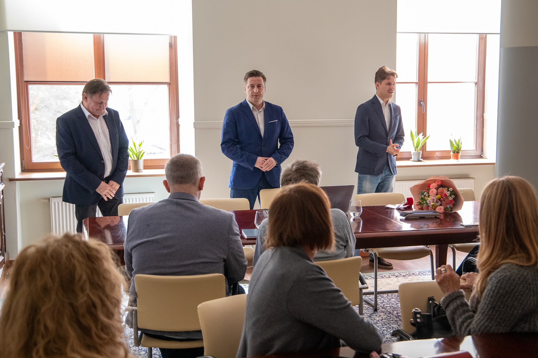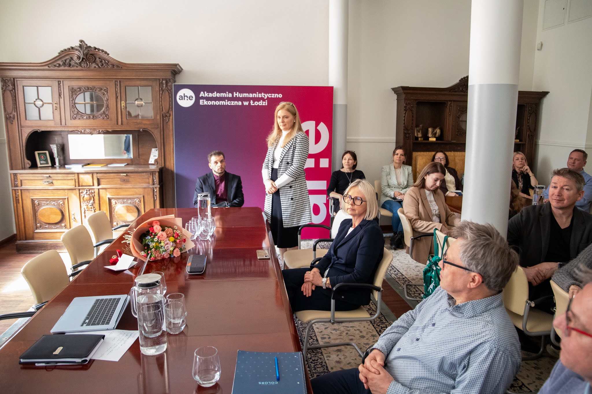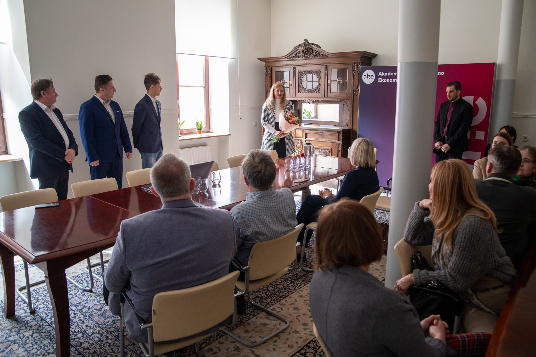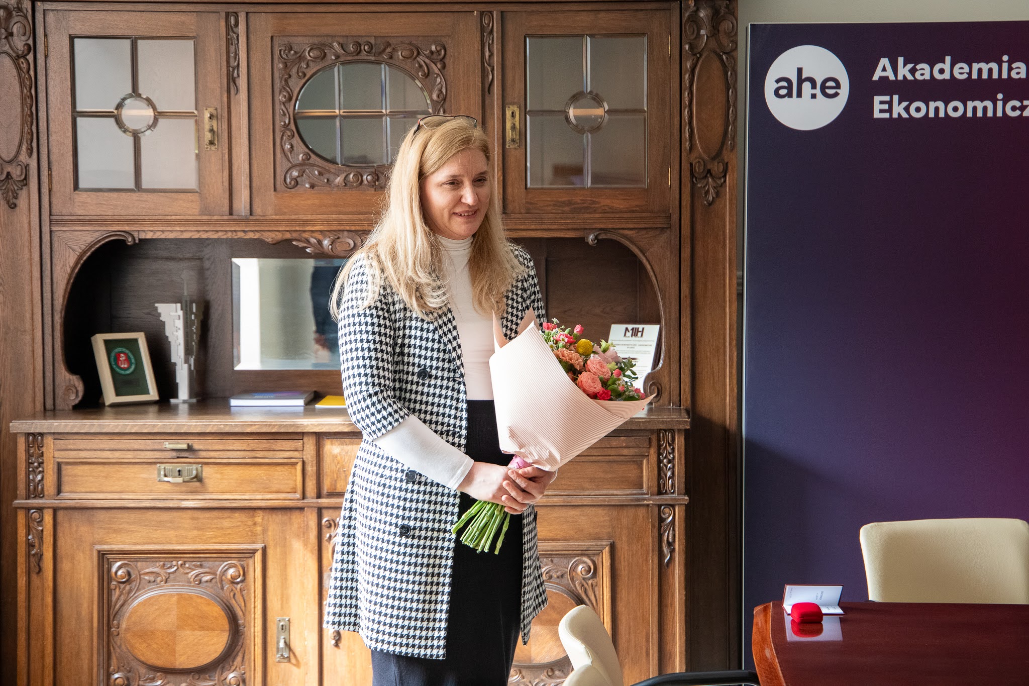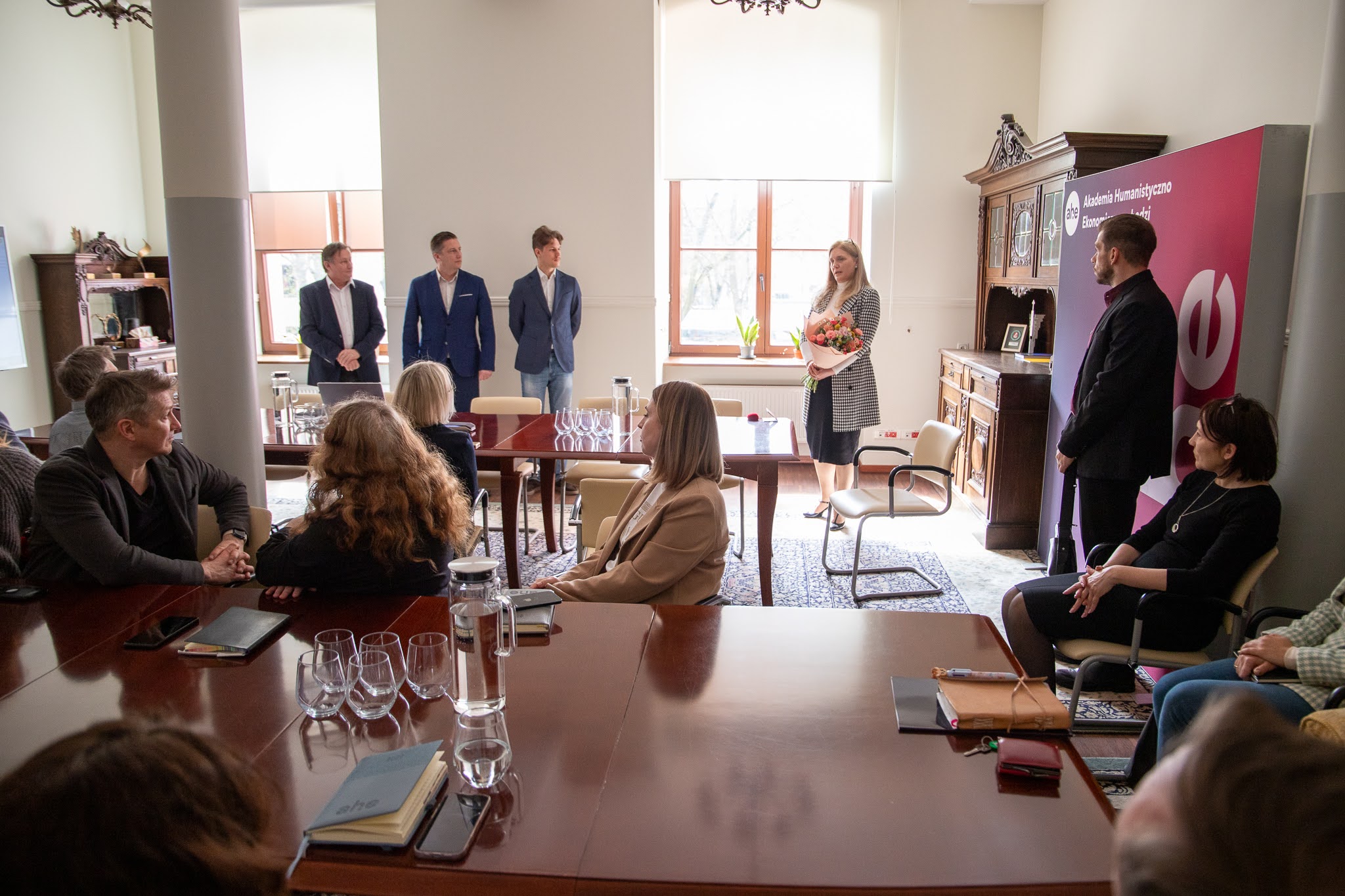 Podczas uroczystego Kolegium Rektorsko-Dziekańskiego 13 kwietnia 2026 r. odznakę honorową wręczyli: Damazy Stasiak - prezydent AHE w Łodzi, dr Wiesław Przybyła - rektor AHE w Łodzi oraz adw. dr Piotr Bogacki - prorektor ds. kształcenia.