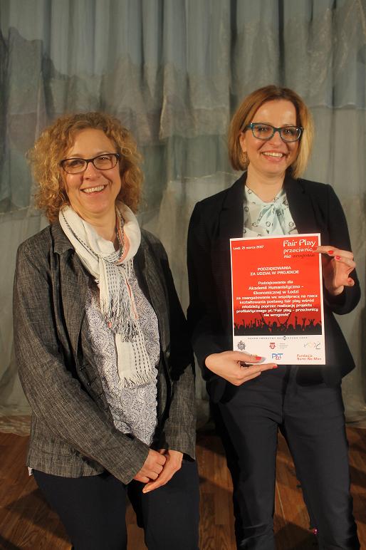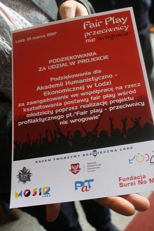 „Fair play – przeciwnicy nie wrogowie” to nazwa projektu, który stworzyli funkcjonariusze Zespołu Profilaktyki Społecznej Wydziały Prewencji Komendy Miejskiej Policji w Łodzi. Pomysłodawcy projektu uczą młodzież jak kulturalne i pozytywnie korzystać z widowisk sportowych. Laureaci konkursu poprzez etiudę, skecz kabaretowy pokazali jak wygląda odpowiedzialne kibicowanie, nie zabrakło również przykładów wyśmiewających negatywne zachowanie pseudoikibców.