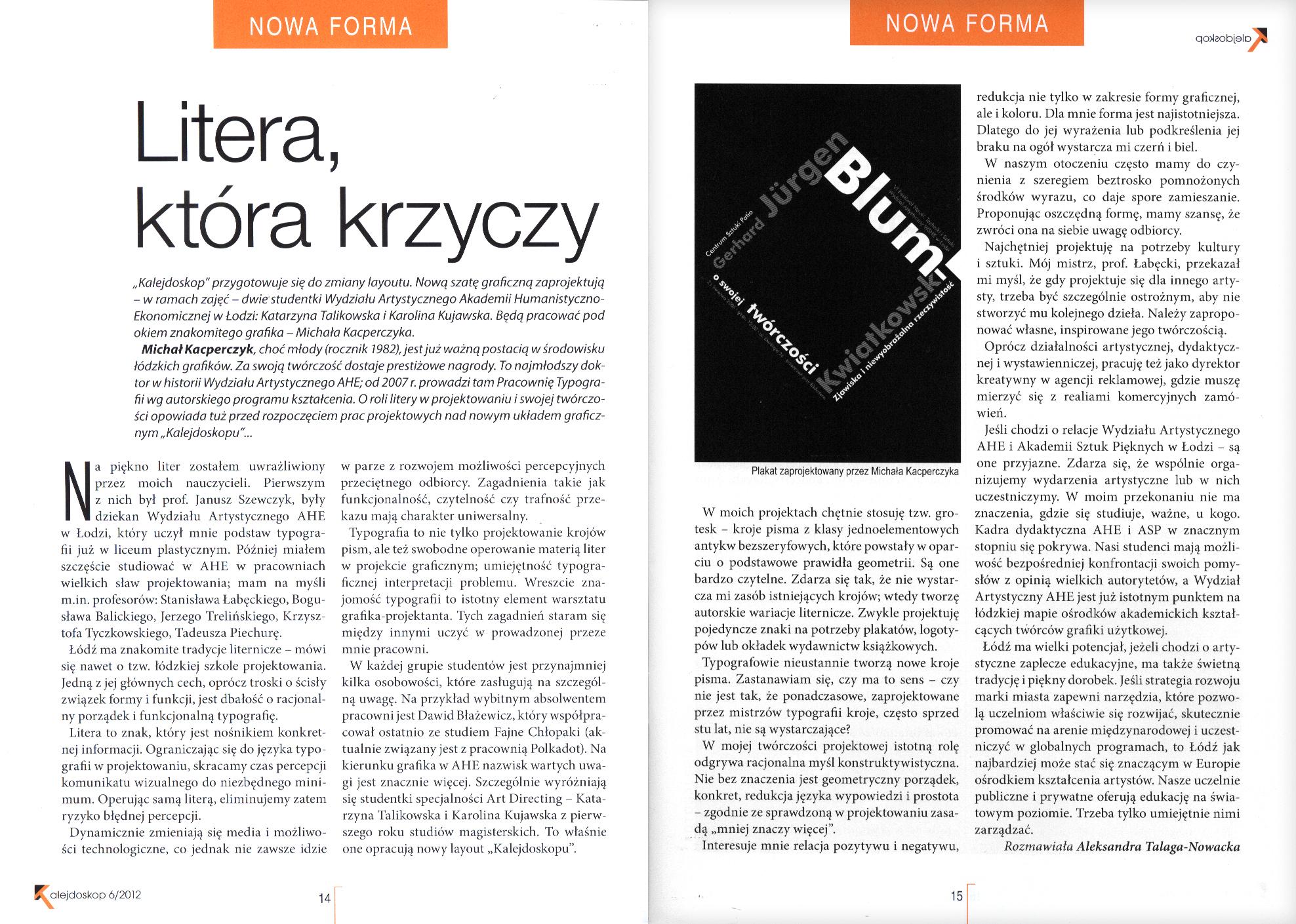 „Kalejdoskop” przygotowuje się do zmiany szaty graficznej! Nowy layout zaprojektują dwie najlepsze studentki pierwszego roku studiów magisterskich Wydziału Artystycznego Akademii Humanistyczno-Ekonomicznej: Katarzyna Talikowska i Karolina Kujawska – pod okiem wykładowcy Michała Kacperczyka. Gratulujemy!