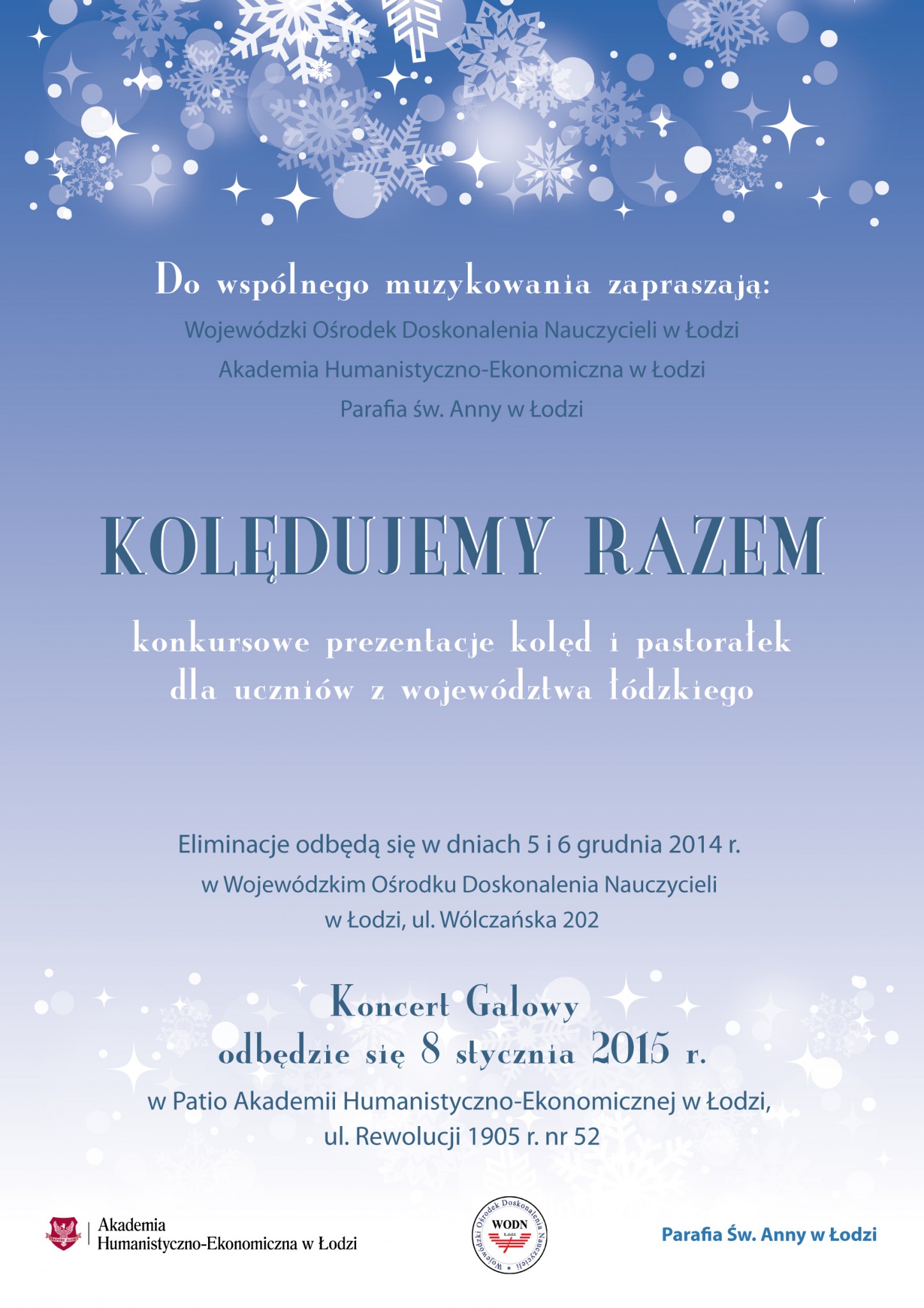 Organizatorzy Konkursowych Prezentacji Kolęd i Pastorałek zapraszają wykonawców wraz z opiekunami na Koncert Galowy, który odbędzie się 8 stycznia 2015 r. o godz. 12.00 w Patio Akademii Humanistyczno-Ekonomicznej w Łodzi ul. Rewolucji 1905 r. nr 52. Podczas koncertu jury ogłosi listę nagrodzonych i wyróżnionych solistów i zespołów.