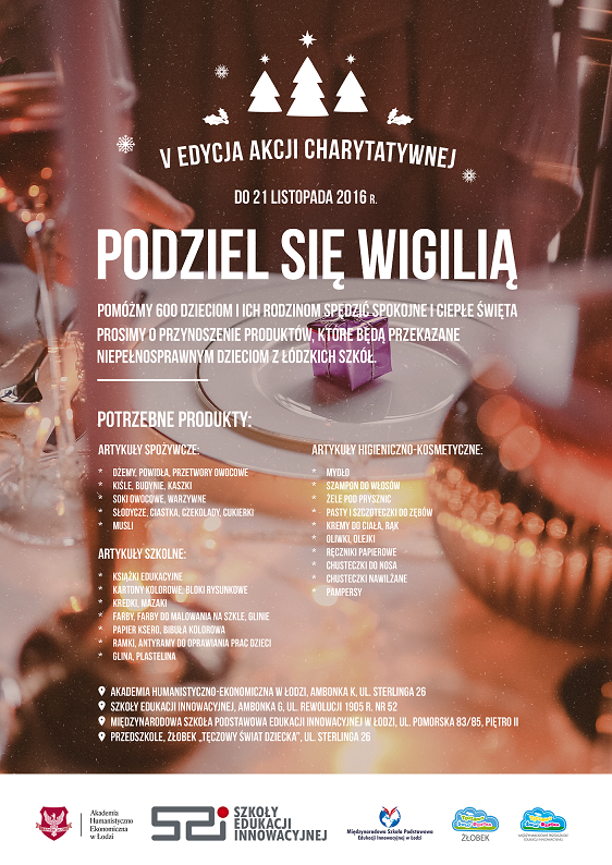 W ramach akcji „PODZIEL SIĘ WIGILIĄ" zbieramy produkty spożywcze, kosmetyczne, higieniczne i artykuły szkolne, które wspólnie przekażemy niepełnosprawnym dzieciom z łódzkich szkół.