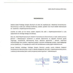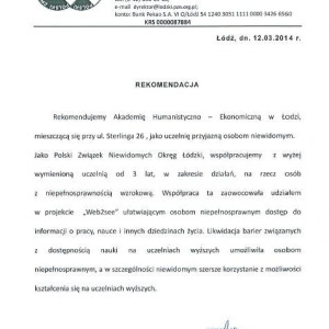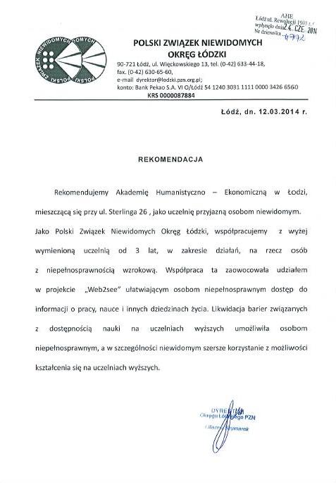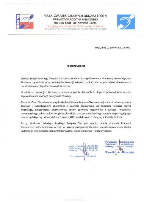Polski Związek Niewidomych Okręg Łódzki oraz Polski Związek Głuchych Oddział Łódzki wyraziły rekomendację dla działań Akademii Humanistyczno-Ekonomicznej w Łodzi dotyczących wspierania studentów z niepełnosprawnością słuchową i wzrokową. Uczelnia wprowadziła wiele zmian w infrastrukturze oraz systemie pomocy osobom, które wymagają odpowiednich warunków do komfortowego studiowania.