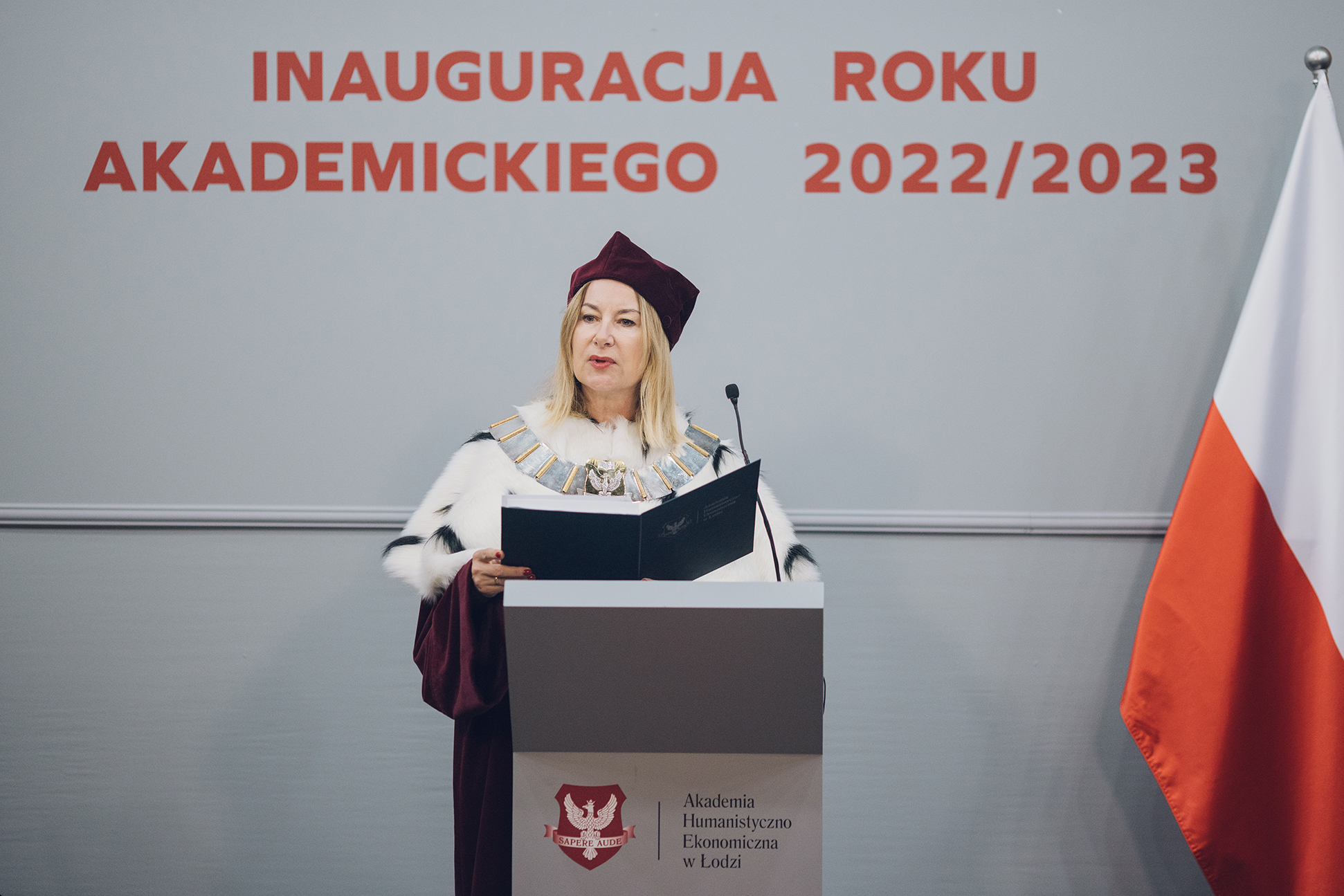 W przemówieniu prof. nadzw. dr hab. Elżbieta Dul-Ledwosińska rektor uczelni podkreśliła, że do wspólnoty Akademii dołącza coraz liczniejsze grono studentów, którzy tutaj właśnie upatrują szansy na osobisty rozwój, pozyskanie wiedzy i osiągnięcie kompetencji kreatywnych, bez których trudno o sukces w życiu zawodowym, społecznym i prywatnym. Pani rektor podkreśliła, że Akademię w równym stopniu tworzą studenci i wykładowcy, jak i nasi partnerzy technologiczni, dzięki którym program naszych studiów przełamuje akademicką rutynę.