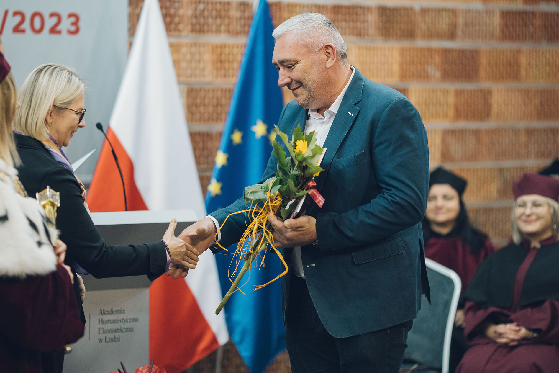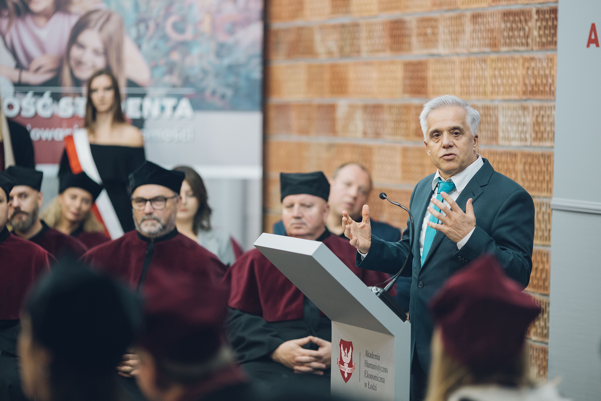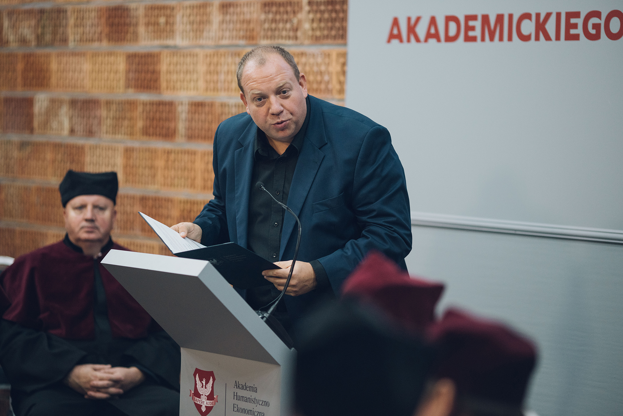 Uroczystość poprowadził Bartłomiej Nowosielski, absolwent filologii polskiej i pedagogiki w AHE. Pracownik naszej uczelni w latach 1998-2004, w działach rekrutacji, promocji oraz nauki. Przewodniczący Rady Studentów AHE w czasie studiów. Aktor, absolwent Wydziału Aktorskiego Państwowej Wyższej Szkoły Filmowej, Telewizyjnej i Teatralnej im. Leona Schillera w Łodzi. Od 2008 roku na stałe w zespole warszawskiego Teatru Ateneum. Pedagog, nauczyciel młodzieży, wykładowca. Pracował między innymi z Mikołajem Grabowskim, Bogusławem Lindą, Maciejem Ślesickim, Juliuszem Machulskim, Arturem Tyszkiewiczem czy Wawrzyńcem Kostrzewskim.