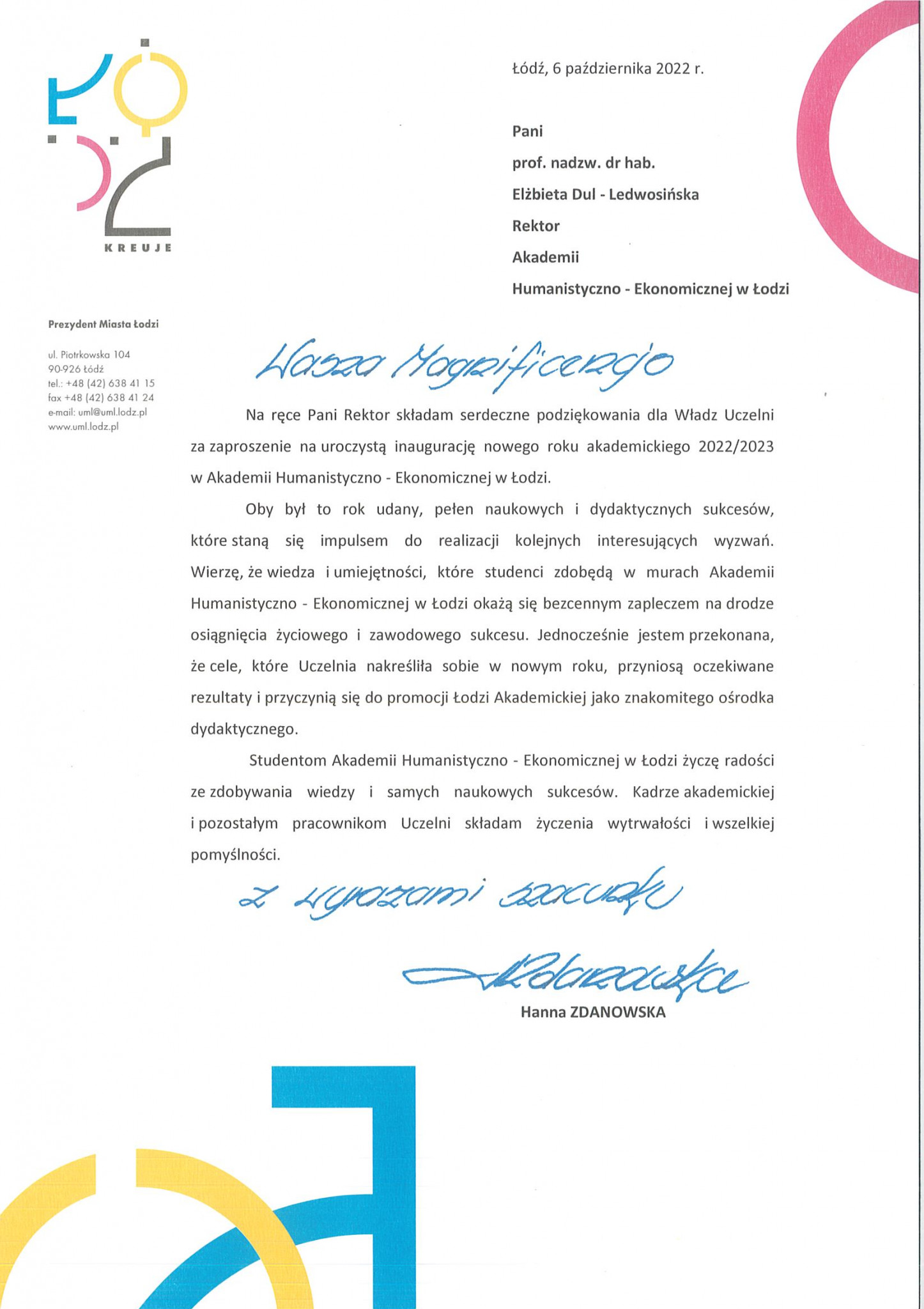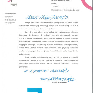 Hanna Zdanowska Prezydent Miasta Łodzi w przesłanym liście napisała: Oby był to rok udany, pełen naukowych i dydaktycznych sukcesów, które staną się impulsem do realizacji kolejnych interesujących wyzwań. Wierzę, że wiedza i umiejętności, które studenci zdobędą w murach Akademii Humanistyczno-Ekonomicznej w Łodzi okażą się bezcennym zapleczem na drodze osiągniecia życiowego i zawodowego sukcesu. Jednocześnie jestem przekonana, że cele, które Akademia nakreśliła sobie w nowym roku, przyniosą oczekiwane rezultaty i przyczynią się do promocji Łodzi Akademickiej jako znakomitego ośrodka dydaktycznego.