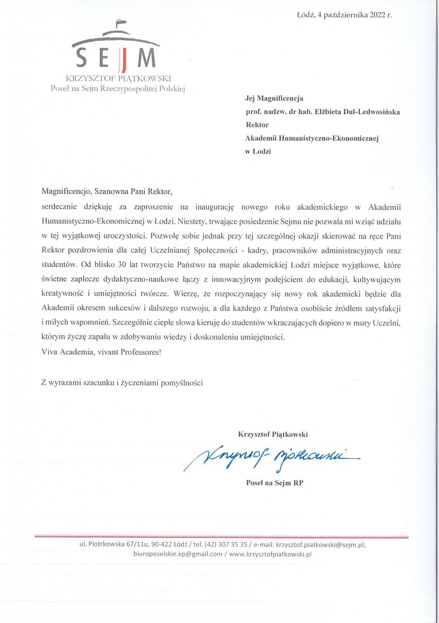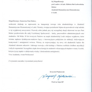 Swoje pozdrowienia dla uczelnianej społeczności przesłał również Krzysztof Piątkowski, Poseł na Sejm RP. Czytamy w nim między innymi: Od blisko 30 lat tworzycie Państwo na mapie akademickiej Łodzi miejsce wyjątkowe, które świetne zaplecze dydaktyczno-naukowe łączy z innowacyjnym podejściem do edukacji, kultywując kreatywność i umiejętności twórcze. Wierzę, że rozpoczynający się nowy rok akademicki będzie dla Akademii okresem sukcesów i dalszego rozwoju.