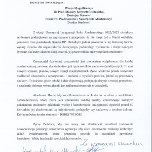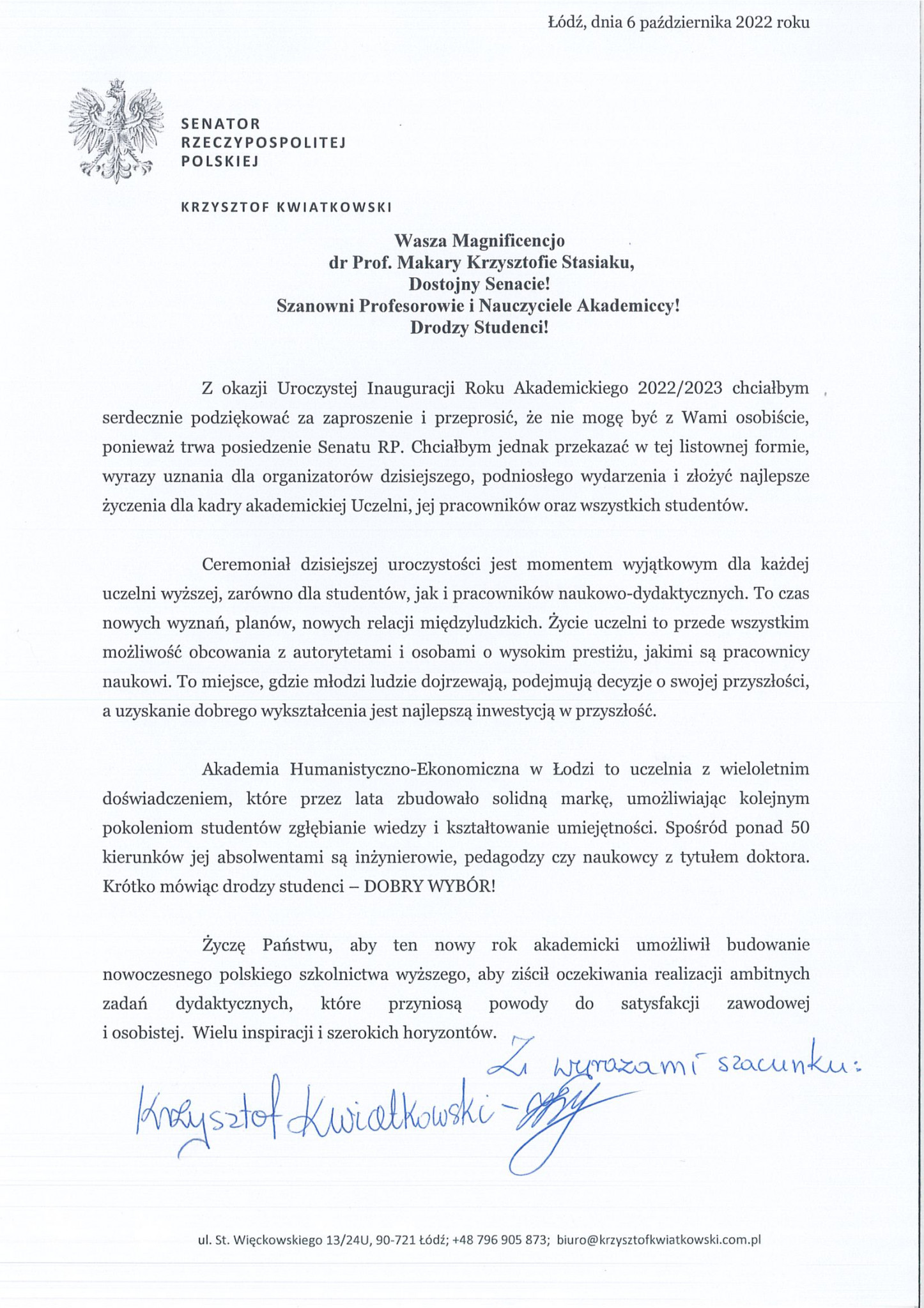 W przesłanym liście Krzysztof Kwiatkowski, senator RP napisał między innymi: Akademia Humanistyczno-Ekonomiczna w Łodzi to uczelnia z wieloletnim doświadczeniem, które przez lata zbudowała solidną markę, umożliwiając kolejnym pokoleniom studentów zgłębianie wiedzy i kształtowanie umiejętności. Jej absolwentami są inżynierowie, pedagodzy czy naukowcy z tytułem doktora. Krótko mówiąc drodzy studenci – dobry wybór. Życzę Państwu, by ten nowy rok akademicki umożliwił budowanie nowoczesnego polskiego szkolnictwa wyższego, aby ziścił oczekiwania realizacji ambitnych zadań dydaktycznych, które przyniosą powody do satysfakcji zawodowej i osobistej.