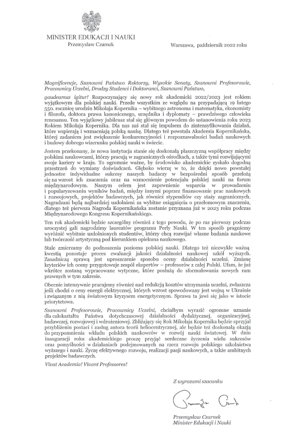 Poseł na Sejm RP Tomasz Trela podkreślił w swoim liście, że dla młodych ludzi czas studiów to czas poszukiwania własnej drogi i szansa na zdobycie wiedzy oraz nieco życiowego doświadczenia. Z kolei dla kadry naukowej nowy rok akademicki jest jednocześnie początkiem i kontynuacją pracy naukowej, pracy ze studentami, ale także szansą na nowe wyzwania dydaktyczne.