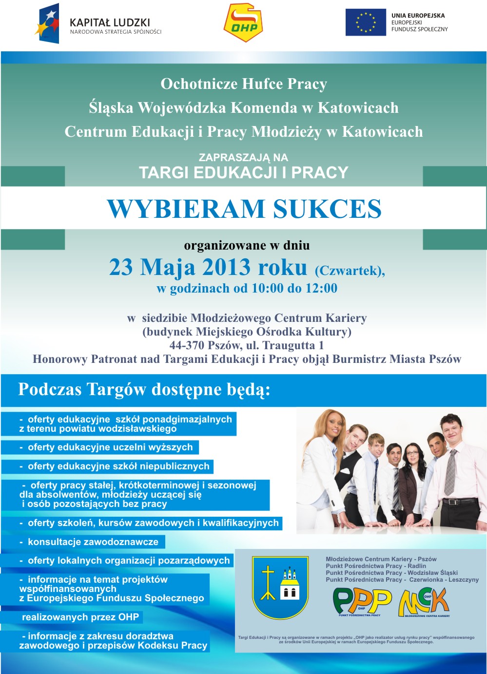 23 maja 2013 r. w godzinach 10.00 - 12.00 odbędą się Targi Edukacji i Pracy w Pszowie w siedzibie Młodzieżowego Centrum Kariery. Zapraszamy na stoisko Wydziału Zamiejscowego w Wodzisławiu Śląskim Akademii Huamnistyczno-Ekonomicznej w Łodzi. Obrazy galerii