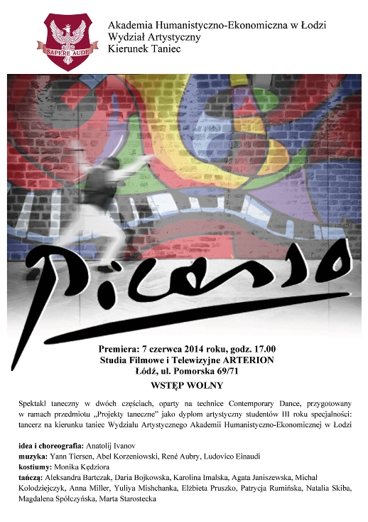 Picasso – spektakl taneczny, w bardzo plastyczny i poetycki sposób przybliża twórczość jednego z najsłynniejszych malarzy hiszpańskich XX wieku, Pabla Picassa.