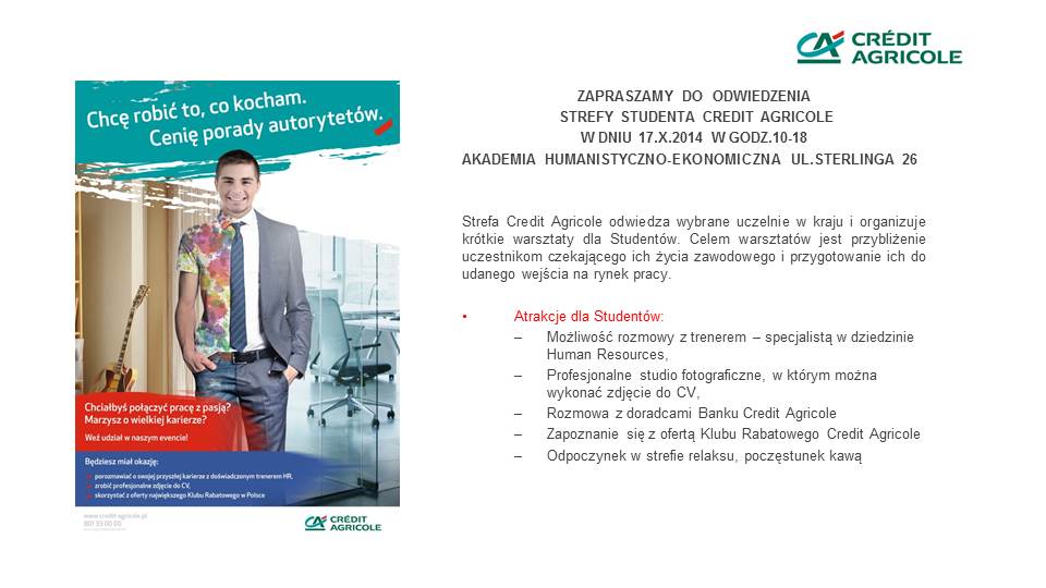 Zapraszamy do odwiedzenia Strefy Studenta Credit Agricole w dniu 17 października w godzinach 10.00-18.00 w budynku K.