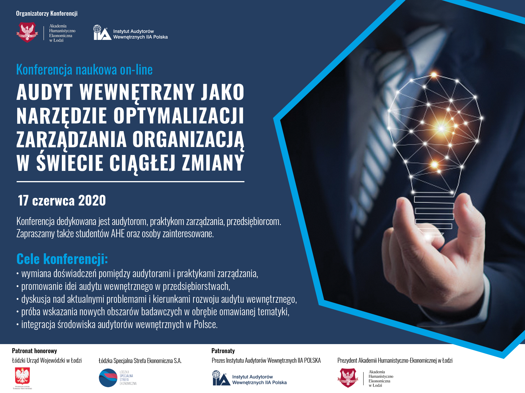 Zapraszamy studentów i słuchaczy Akademii Humanistyczno-Ekonomicznej w Łodzi na konferencję naukową on-line „Audyt wewnętrzny jako narzędzie optymalizacji zarządzania organizacją w świecie ciągłej zmiany”.